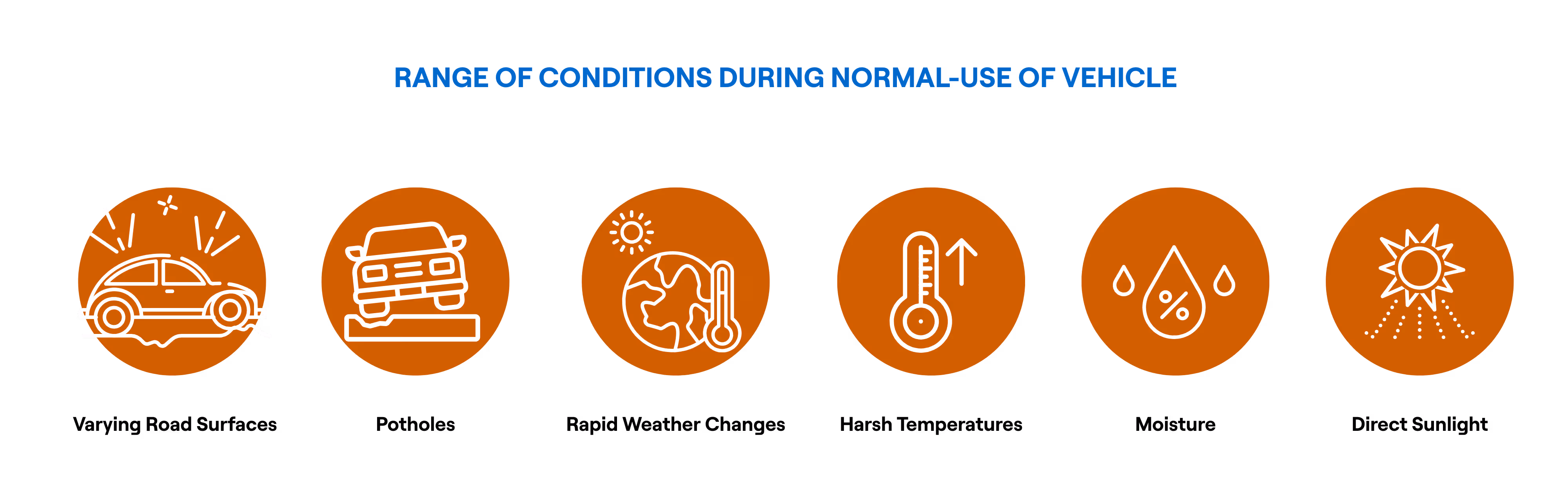 For a vehicle, the range of conditions that will be encountered during normal use are substantial. These conditions include: