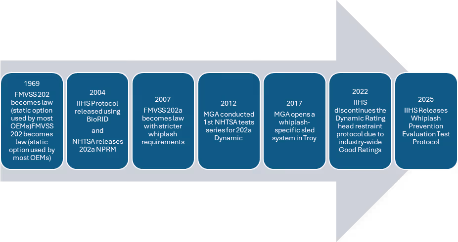 Federal Motor Vehicle Safety Standard (FMVSS) 202a – Head Restraints and Insurance Institute for Highway Safety (IIHS) Head Restraint Dynamic Protocol are industry-standard whiplash tests. Although different in many ways procedurally, both test protocols set forth criteria pertaining to the dimensional and safety requirements for head restraints in low-speed rear crashes involving passenger vehicles, multipurpose vehicles, trucks, and buses. Starting with the original FMVSS 202 standard in 1969, head restraint development around occupant protection in whiplash test scenarios has reached high performance levels in most vehicle types over the last 50+ years. In 2022, IIHS discontinued the testing since all recent testing had resulted in Good for every vehicle tested. In December 2025, IIHS published an updated protocol intended to improve the evaluation of seats and head restraints in whiplash crash scenarios.