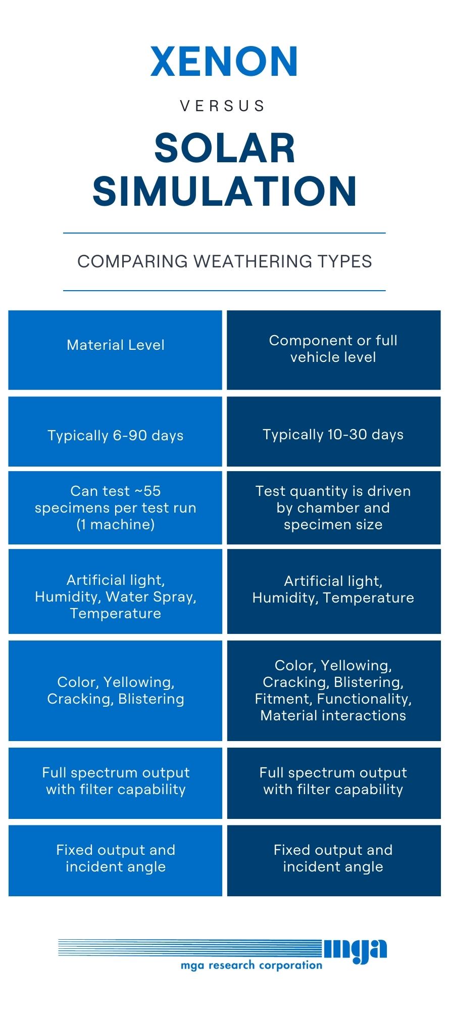 MGA’s solar simulation capabilities allow for the evaluation of complex geometries and the testing of complete or partial assemblies. With our extended capabilities, we can support all portions of a test plan that may need solar simulation, whether that be measurements pre-/post-test or additional testing on a solar-aged sample. Going beyond solar testing, MGA can support full DVP&Rs at one location allowing for a more optimized testing timeline. MGA will collaborate with customers to provide a robust and comprehensive testing experience.