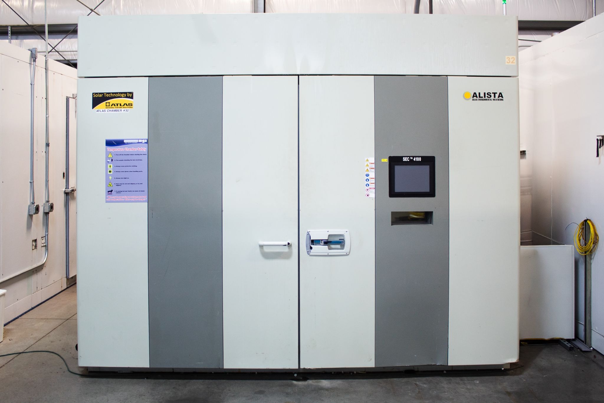 Solar simulation chambers are typically larger chambers that use Metal Halide Global (MHG) lamps or a similar piece of equipment. These lamps allow for not only an accurate simulation of the sun but also apply the heat load you would encounter in nature. Additional fixtures allow for simulation of vehicle interiors, different angles of sunlight, and shaded components.