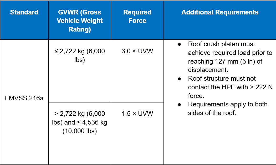 FMVSS 216a (Roof Crush Resistance) is a regulation defined by the National Highway Traffic Safety Administration (NHTSA). It sets roof strength requirements for most passenger vehicles sold in the U.S. market. This regulation is an extension of the original FMVSS 216 rule, updated to reflect changes in vehicle size, speed, and to include a broader category of vehicles, such as multipurpose passenger vehicles. The test requirements are based on the unloaded vehicle weight (UVW) as well as head contact area defined by a head form positioning device (HPF) positioned in the front occupant areas. Compliance with FMVSS 216a is required for all vehicles manufactured on or after September 1, 2015.